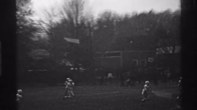 > Aerial view of high school football game as the sun lights up the landscape