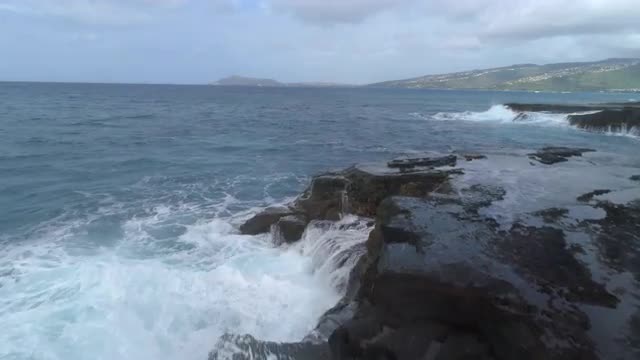 Low angle aerial view of waves crashing cliffs and rocks, Oahu, Hawaii