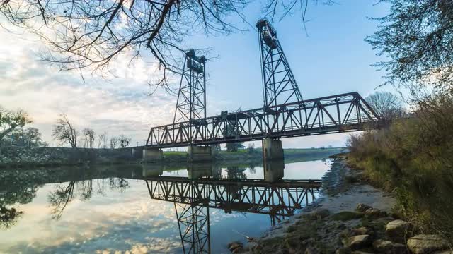 Beautiful time-lapse of city during golden hour, sunset, with scattered clouds.