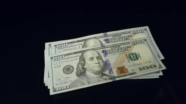 1038407 - Person counting 100 dollar bills on black table top