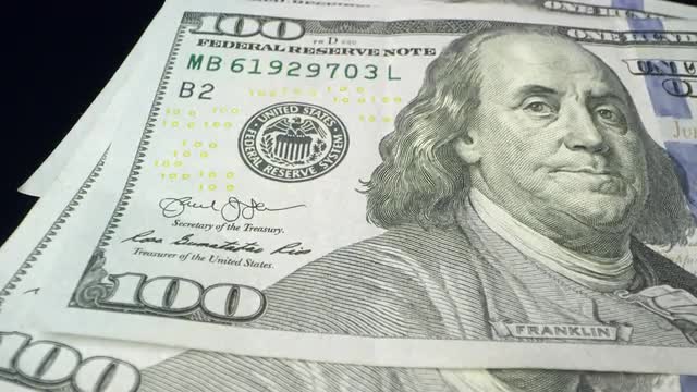 Moving over scattered pile of 100 dollar bills on table.