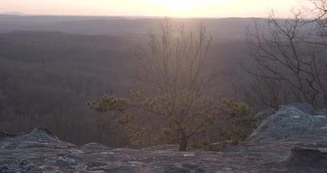 > Backlit tree on cliff at sunset, static