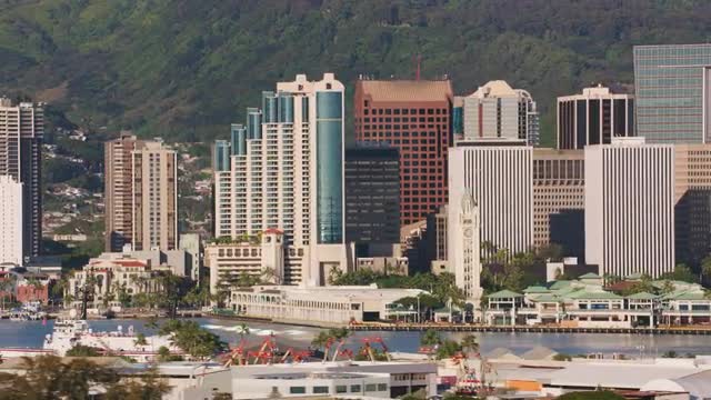 Honolulu, Oahu, Hawaii circa-2018. Aerial view of Aloha Tower in Honolulu, Hawaii. Shot with Cineflex and RED Epic-W Helium.