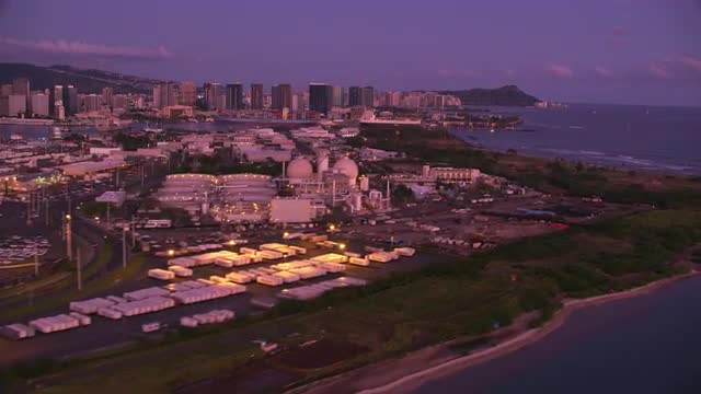 Oahu, Hawaii circa-2018. Flying over Honolulu Harbor towards Honolulu. Shot with Cineflex and RED Epic-W Helium.