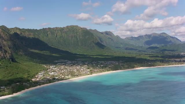 Oahu, Hawaii circa-2018. Aerial view of Waimanalo Beach. Shot with Cineflex and RED Epic-W Helium.