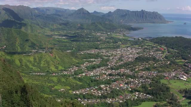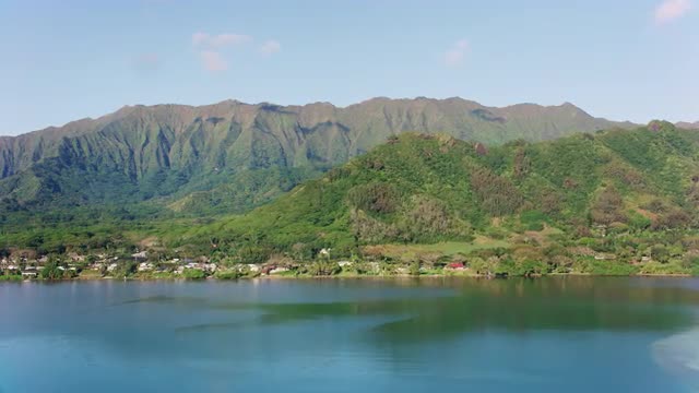 Oahu, Hawaii circa-2018. Aerial view of boat in Kaneohe Bay with Mokolii Islet in foreground. Shot with Cineflex and RED Epic-W Helium.