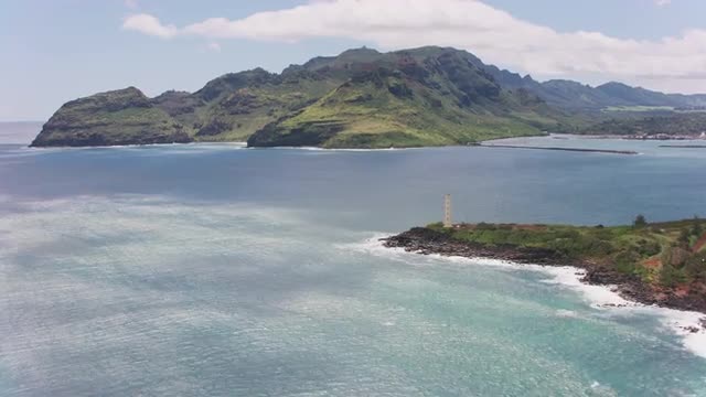Molokai, Hawaii circa-2018. Aerial view Molokai Light Lighthouse on the Molokai coast. Shot with Cineflex and RED Epic-W Helium.