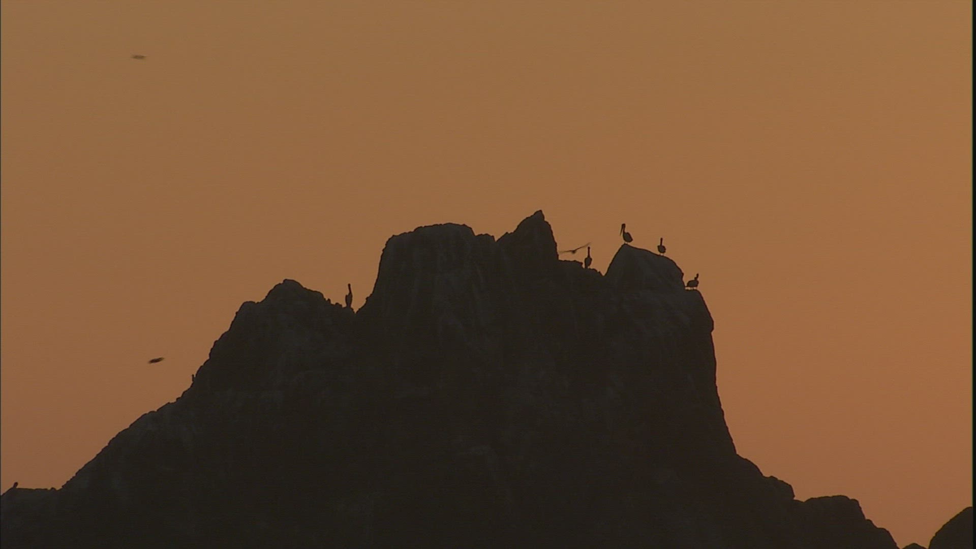 Static sunset, long shot, 135mm, flamingos and an amazing mountains in the background.