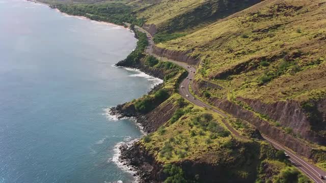 Maui, Hawaii circa-2018. Windy stretch of Honoapiilani Highway on Maui coastline. Shot with Cineflex and RED Epic-W Helium.