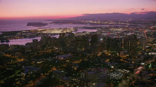 Honolulu, Oahu, Hawaii circa-2018. Aerial view of Honolulu at sunset. Shot with Cineflex and RED Epic-W Helium.