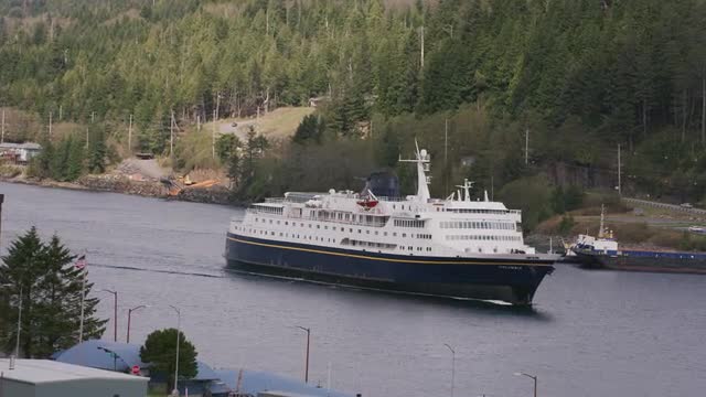 Ketchikan, Alaska circa-2018. Cruise ship in harbor. Shot from helicopter with Cineflex gimbal and RED Epic-W camera.