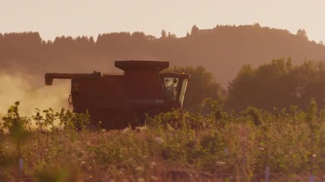 Oregon circa-2018. Tractor driving across field at sunset, Oregon.