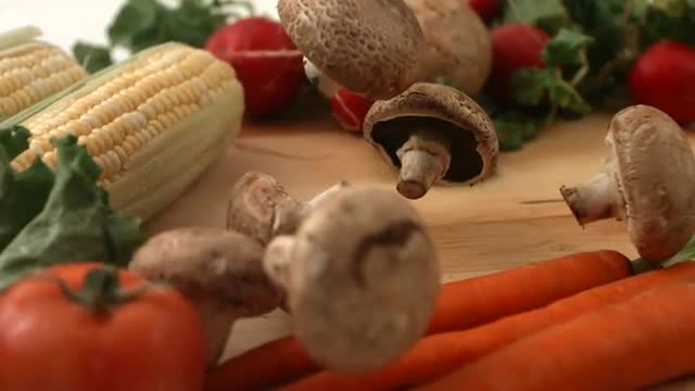 122222 - Mushrooms falling onto cutting board, slow motion