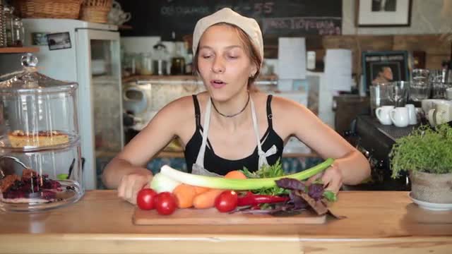 669514 - Female chef showing vegetables on cutting board
