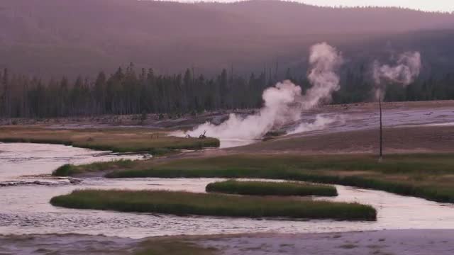 River flowing through Yellowstone National Park with steam in distance