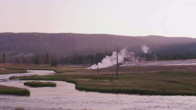 River flowing through Yellowstone National Park with steam in distance