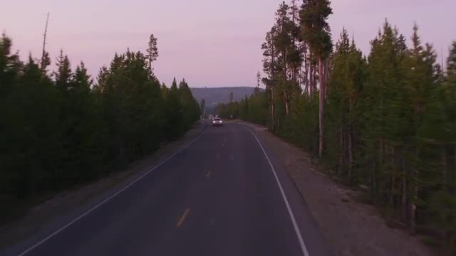 Driving along road at sunset, Yellowstone National Park