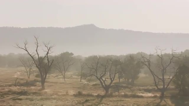 Driving by trees in morning fog, Wyoming