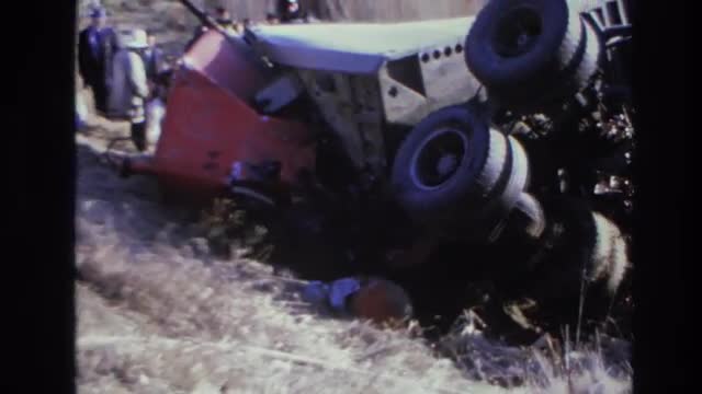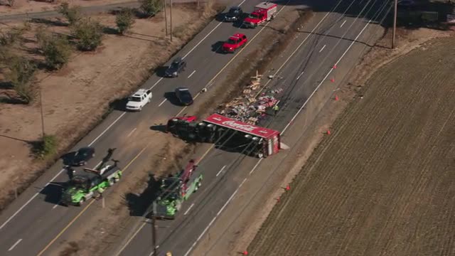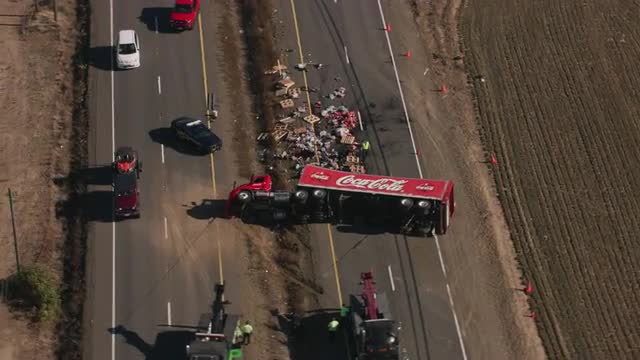 Dundee, Oregon circa-2018. Aerial view of Coca Cola truck flipped over on highway.