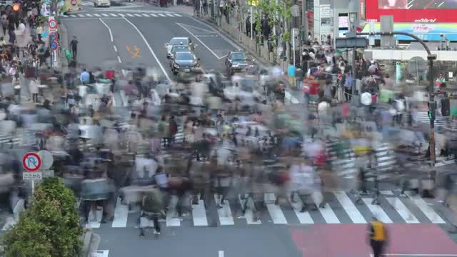 Tokyo, Japan circa-2018. Time lapse shot of cars and people crossing street at Shibuya Crossing in Tokyo, Japan.