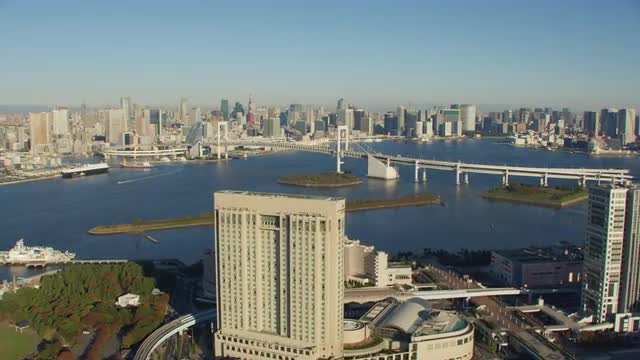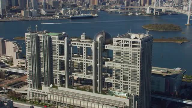 Tokyo, Japan circa-2018. Aerial view of the Fuiji TV building and Rainbow Bridge. Shot from helicopter with RED camera.