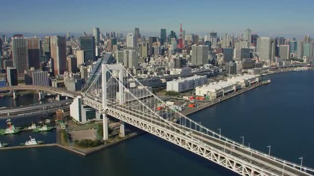 Tokyo, Japan circa-2018. Flying close to Rainbow Bridge with Tokyo Tower in distance. Shot from helicopter with RED camera.