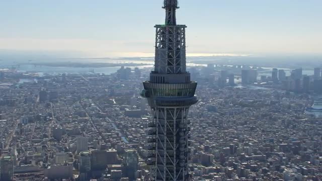 Tokyo, Japan circa-2018. Aerial close up shot of Tokyo Skytree. Shot from helicopter with RED camera.