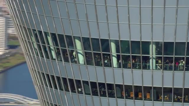 Tokyo, Japan circa-2018. Aerial close up shot of Tokyo Skytree. Shot from helicopter with RED camera.