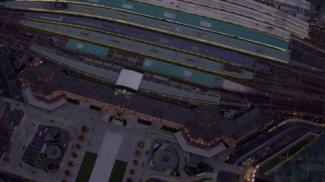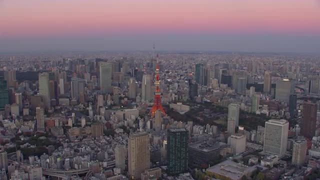 Tokyo, Japan circa-2018. Angled aerial view of Tokyo skyscrapers at night. Shot from helicopter with RED camera.