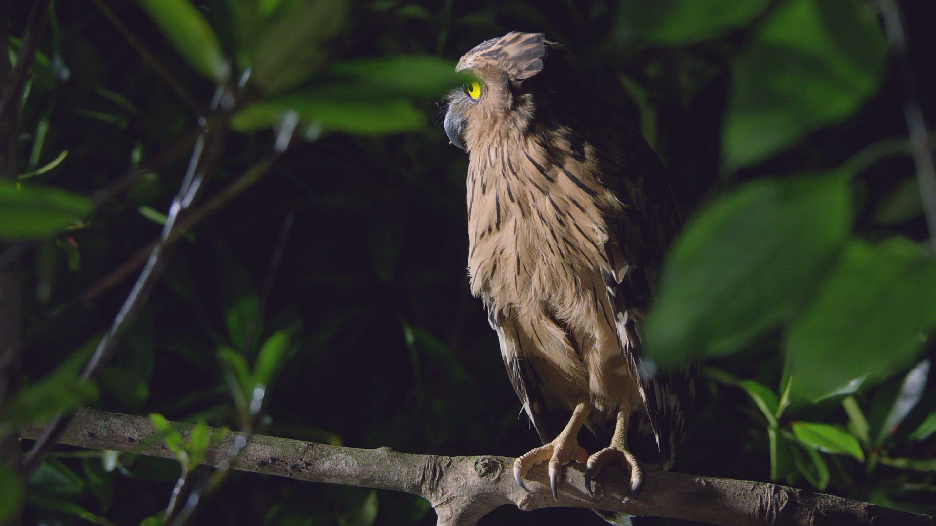 three javanese owls on dry tree branch. owls living on Dieng plateau on island Java, Indonesia