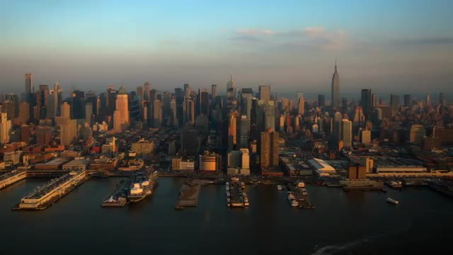 36651 - WIDE AERIAL Midtown Manhattan skyline at sunrise