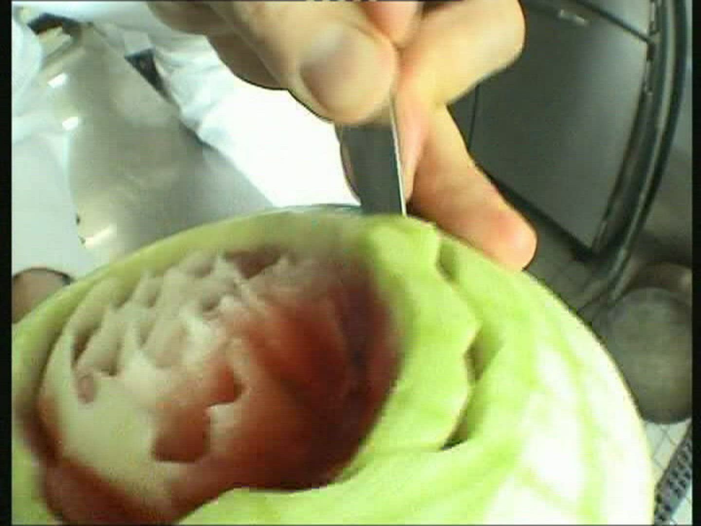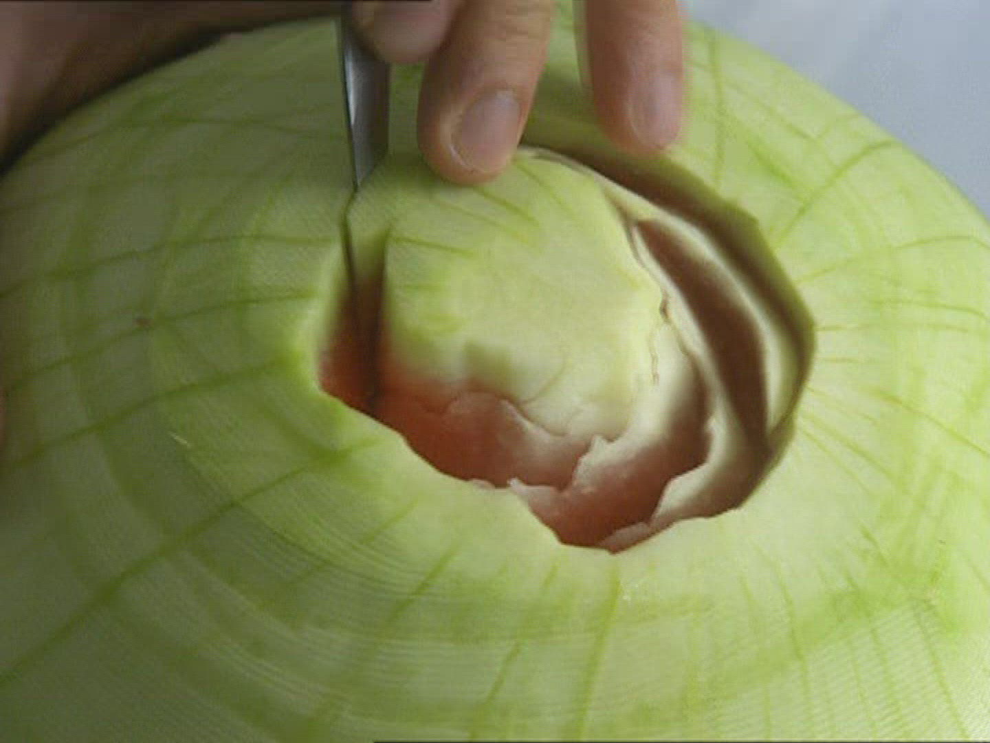 > male hand cuts watermelon