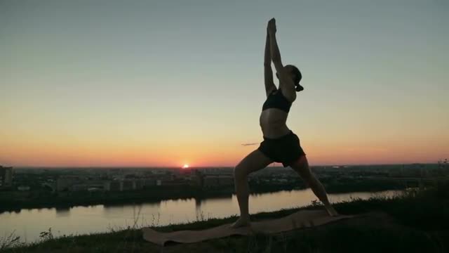 Silhouette of sporty man and woman doing triangle pose in the park at sunset. Sunset light, golden hour. Freedom, health and yoga concept