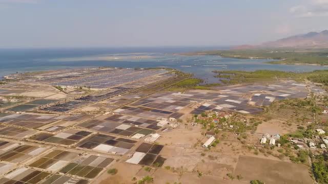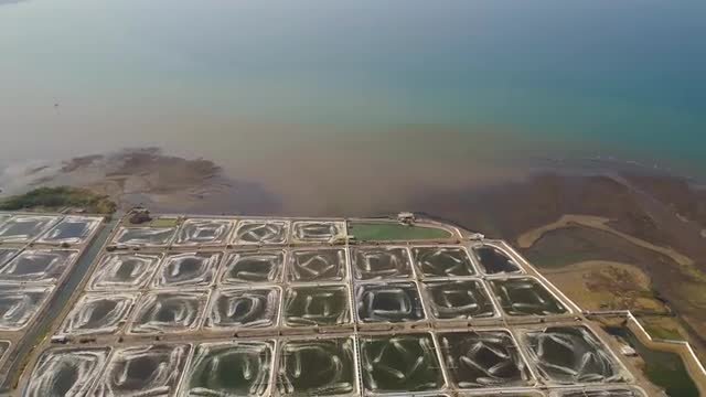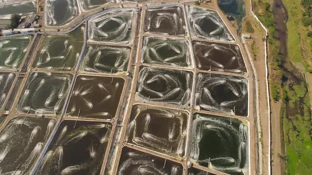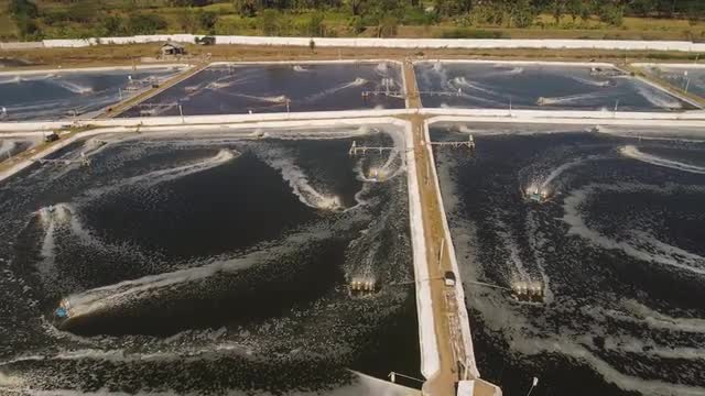 aerial view fish farm with ponds growing fish and shrimp and other seafood. Fish hatchery pond