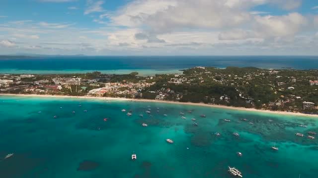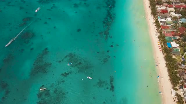 coastline island with coral reef, beach. Coral reef, atoll on Menjangan, colorful reef and perfect snorkeling and scuba diving. Seascape, ocean and beautiful beach paradise. Travel concept. Aerial footage.