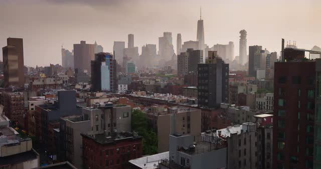 WS Storm over cityscape seen from Lower East Side looking at Freedom tower / New York City, New York, USA