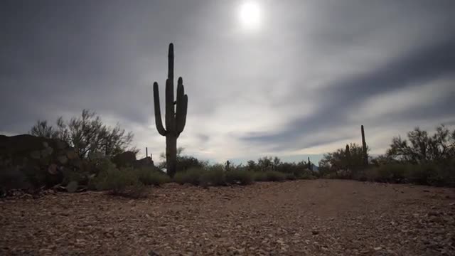 A panoramic motion control time-lapse video of clouds and Saguaro cactus.