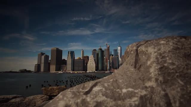 A motion control focus-pull time-lapse video of mid day clouds passing over the New York city skyline from Brooklyn Bridge Park