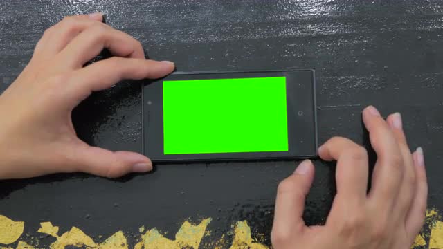 Woman looking at horizontal smartphone with green screen. Close up shot of woman's hands with mobile