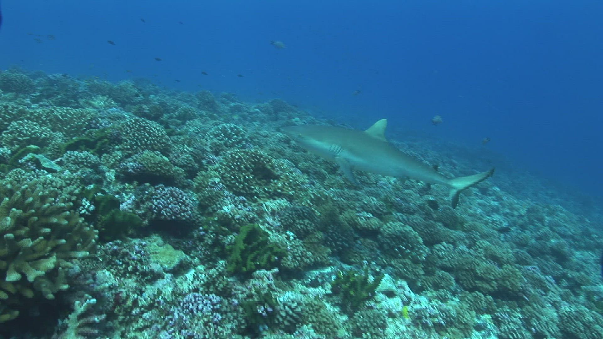 Medium sized shark swims by with aquatic life in the background