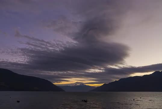 Time lapse with sunset colors in the clouds, in the background, the Yates volcano. Location: Reloncavi estuary, Cochamo.