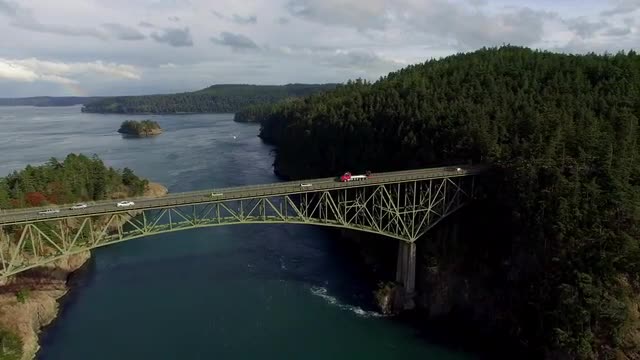 Aerial tilt down shot of cars and people exiting ferry boat