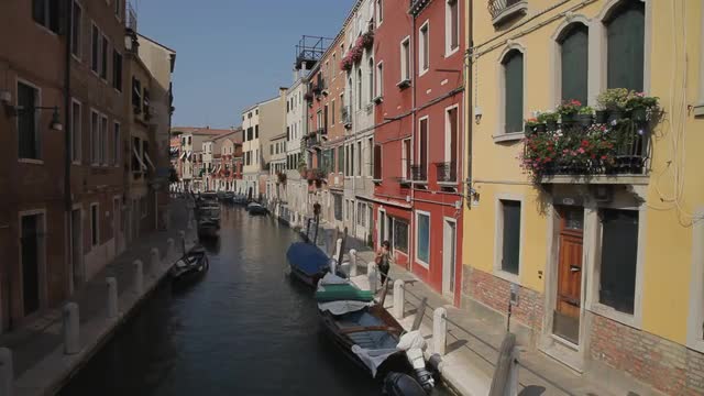 > A woman walking through the streets of Venice, Italy