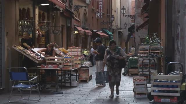 58379 - Panning shot of an alley market in Bologna, Italy.