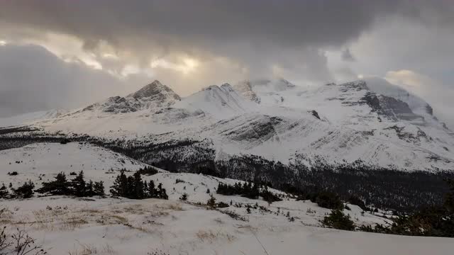 1036003 - 8K Time lapse sunrise clouds flowing over mountains in snow covered landscape