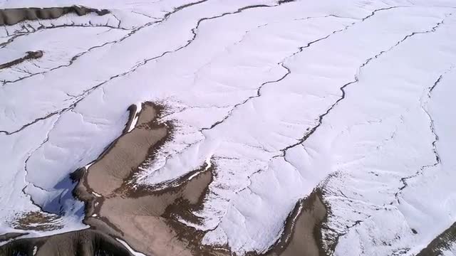 Aerial view flying over Utah desert terrain in winter landscape as snow melts in the Badlands.