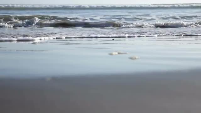 > Young woman's legs on a stones beach, waves splashing the shore on a sunny day, pov