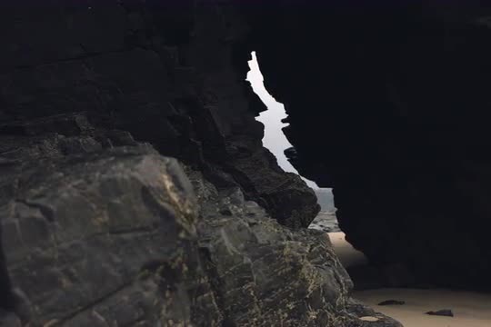 > Cave by the beach rock formation silhouette Cornwall, England, UK