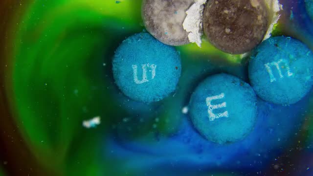 Macro timelapse of m&m dissolving in water.