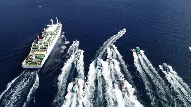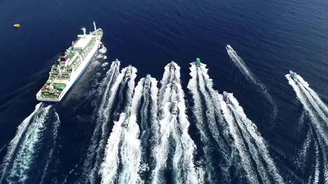 > Boat traveling at Hakodate Ferry Terminal, Hokkaido, Japan